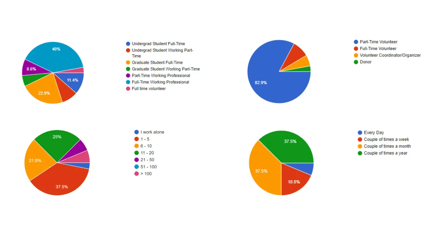 Our survey sample (35 participants) included existing volunteers, Coordinators, and donors mostly from the Greater Seattle area and internationally from India and Palestine. The following is a sample of the questions we asked and the data we received.