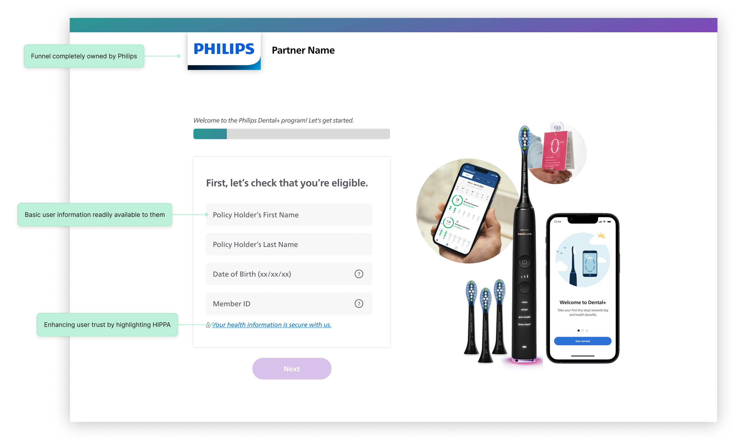 Enhance member utilization of Philips Dental+ by focusing on improving drop-out rate, onboarding completion rate and the Dental+ app download rate.