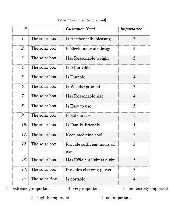 The features above were incorporated in a list of user requirements for the overall Solar box , working with my team , we conducted a competitive analysis with similar products targeted for camping in order to set the ground for our technical and financial constraints.
