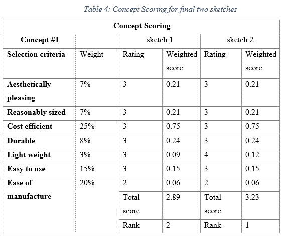 After identifying customer needs and establishing target specifications , I sketched 20 different concepts on three iterations , each concept was screened and validated using a criteria derived from user requirements . After comparing the relative strengths and weaknesses of the concepts. Two concepts as shown in phase two were sketched and screened as shown below.
